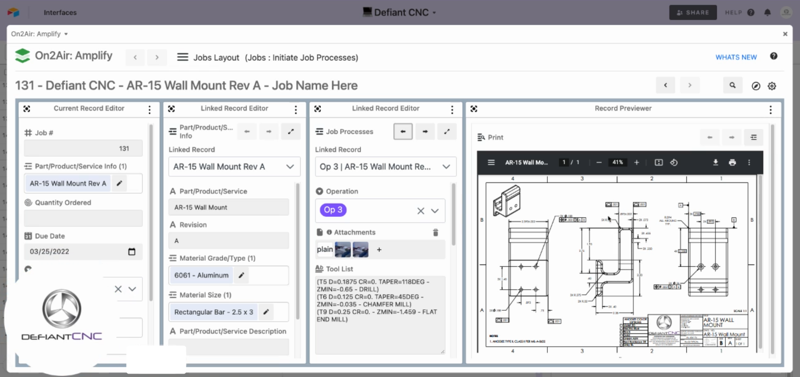 As a customer and fan of other On2Air apps, Jeremy jumped at the chance to use On2Air Amplify for his machine shop base and his ERP systems customers. He immediately saw how helpful it would be to have an Airtable dashboard and a snapshot view of all the information they would need to manufacture a part.