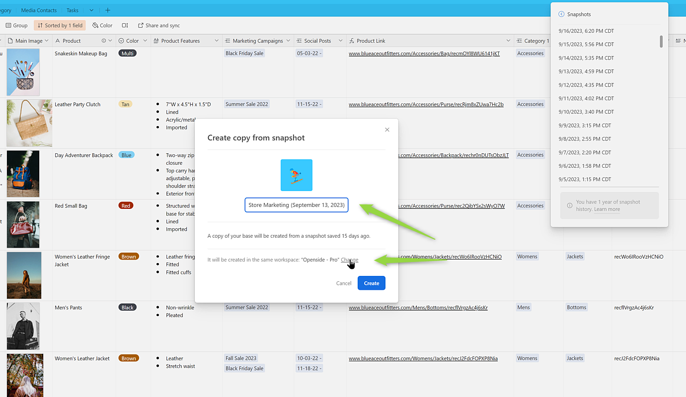 3. Click Create to create a copy of your base from the snapshot date you chose