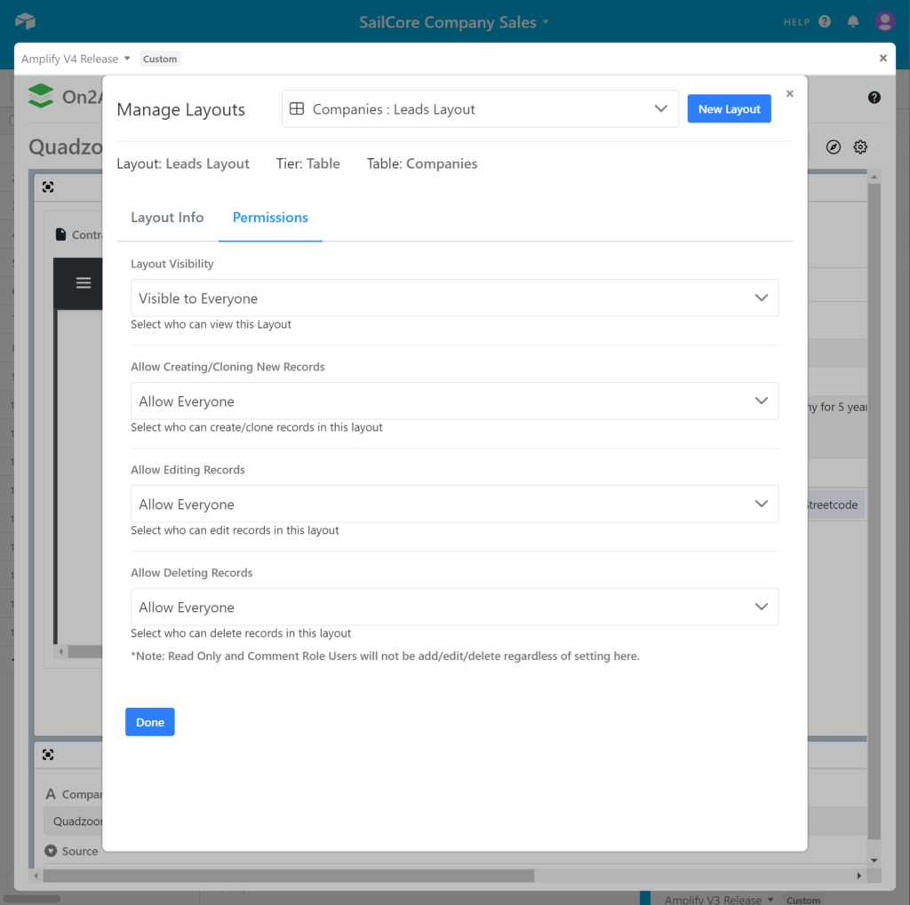 - You can set Permissions available for layouts and records! You can choose to allow or disallow a specific role type or a specific user to create, clone, edit, or delete records. You can create filters so specific users are only focused on the records they need. (please note, a user can still view the data in underlying base. This is meant to help a user focus on data specific to their needs.)