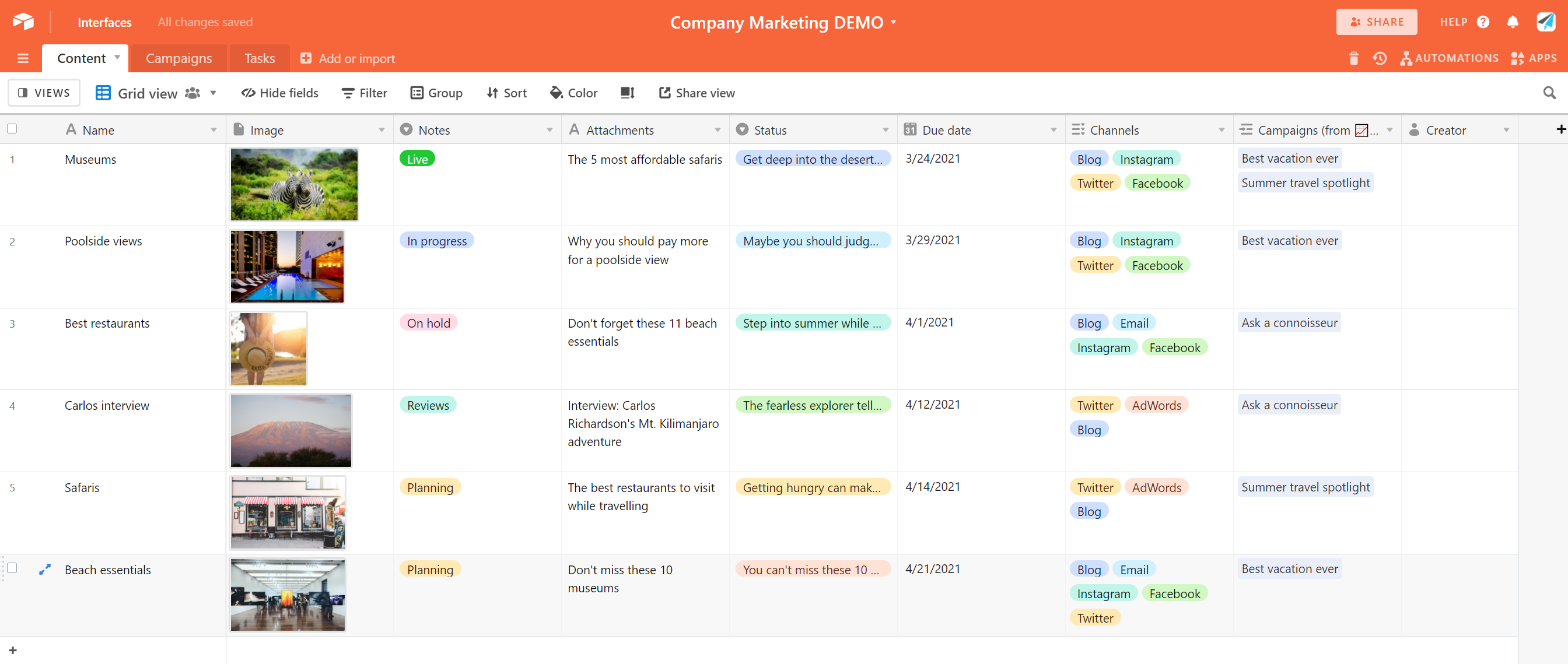 The team at LKF Marketing uses Airtable bases to track client projects, content, tasks, articles, and other documents. Sara creates a base for each new client and shares the base with the client and other LKF staff to use as a central source of information.