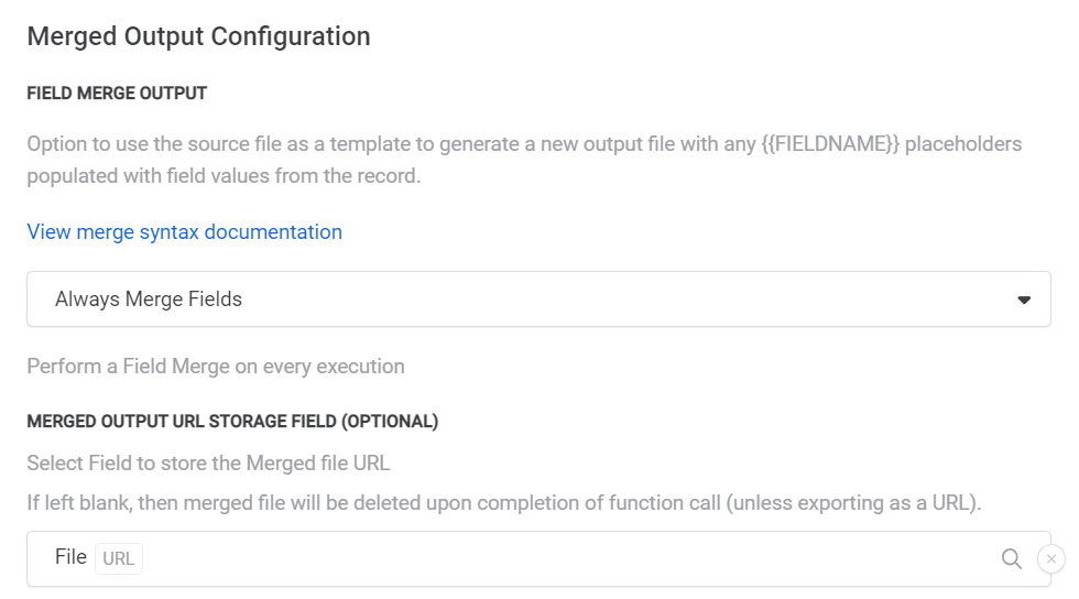 10. In Merged Output Configuration, choose Always Merge Fields to ensure the automation always creates a file with your data. Then, in Merged Output URL Storage Field, choose a URL field from your Airtable base to save the new file URL.