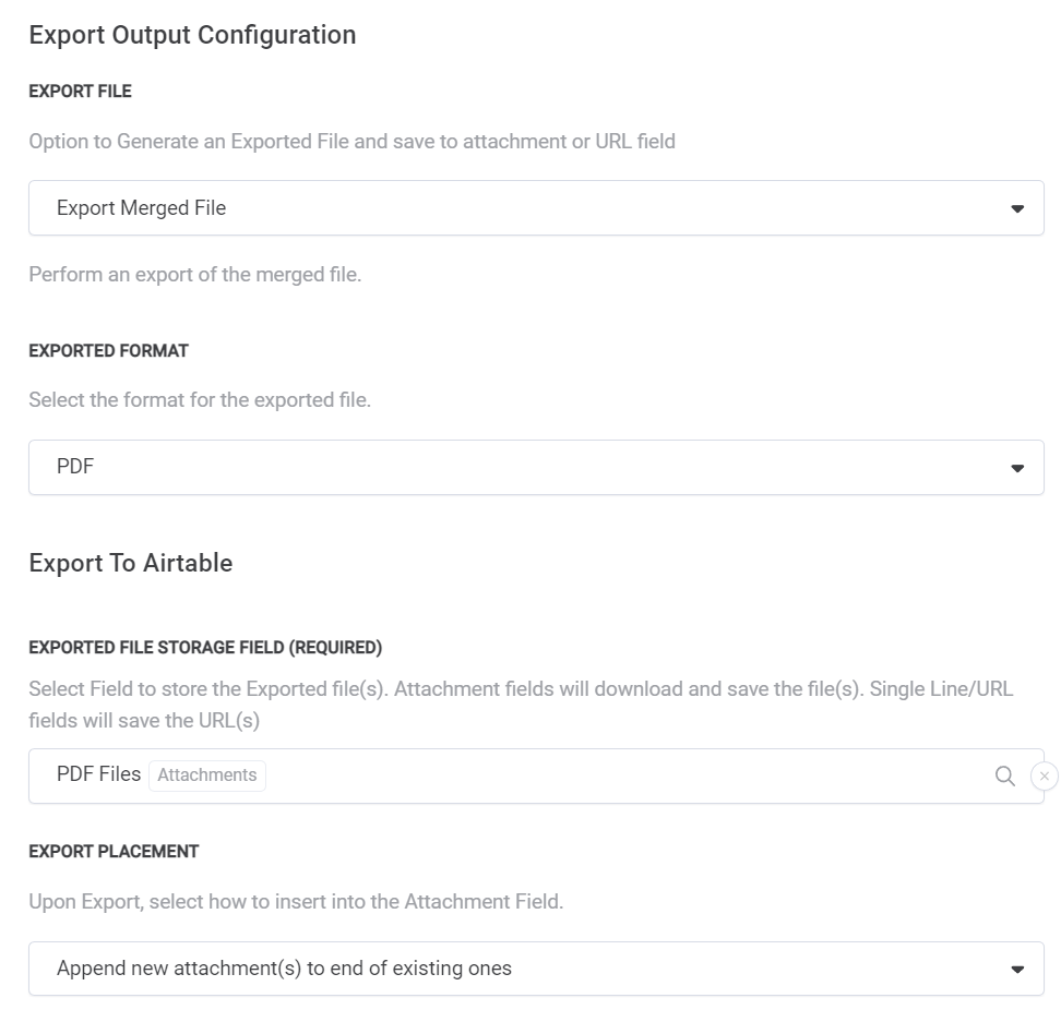 11. To save the new Google Sheets file as a PDF, you can choose Export Merged File and choose the PDF Format. To send it to an Airtable Attachment field, choose an Attachment field and whether to append the file to the end of the other files in the field or replace them.