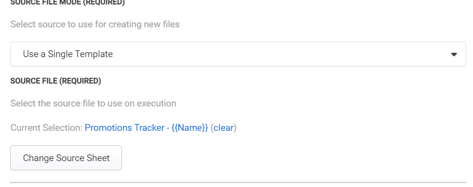 7. In Source File, choose your Source/Template file. In this case, choose the Promotions Tracker Google Sheets file you added to your Drive.