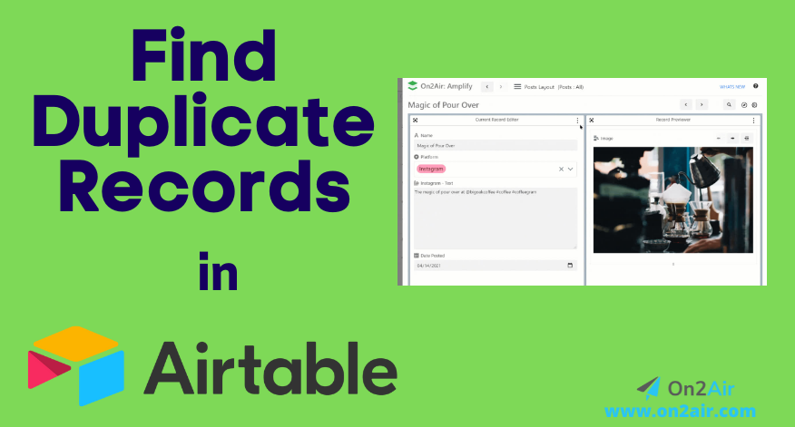 Here’s how you can find (and remove) duplicates in your Airtable records. Sometimes, you enter in records multiple times or sometimes you just need to find duplicates of a specific record or field. The Find Duplicates option in On2Air Amplify helps you search by specific field to find any duplicate information.