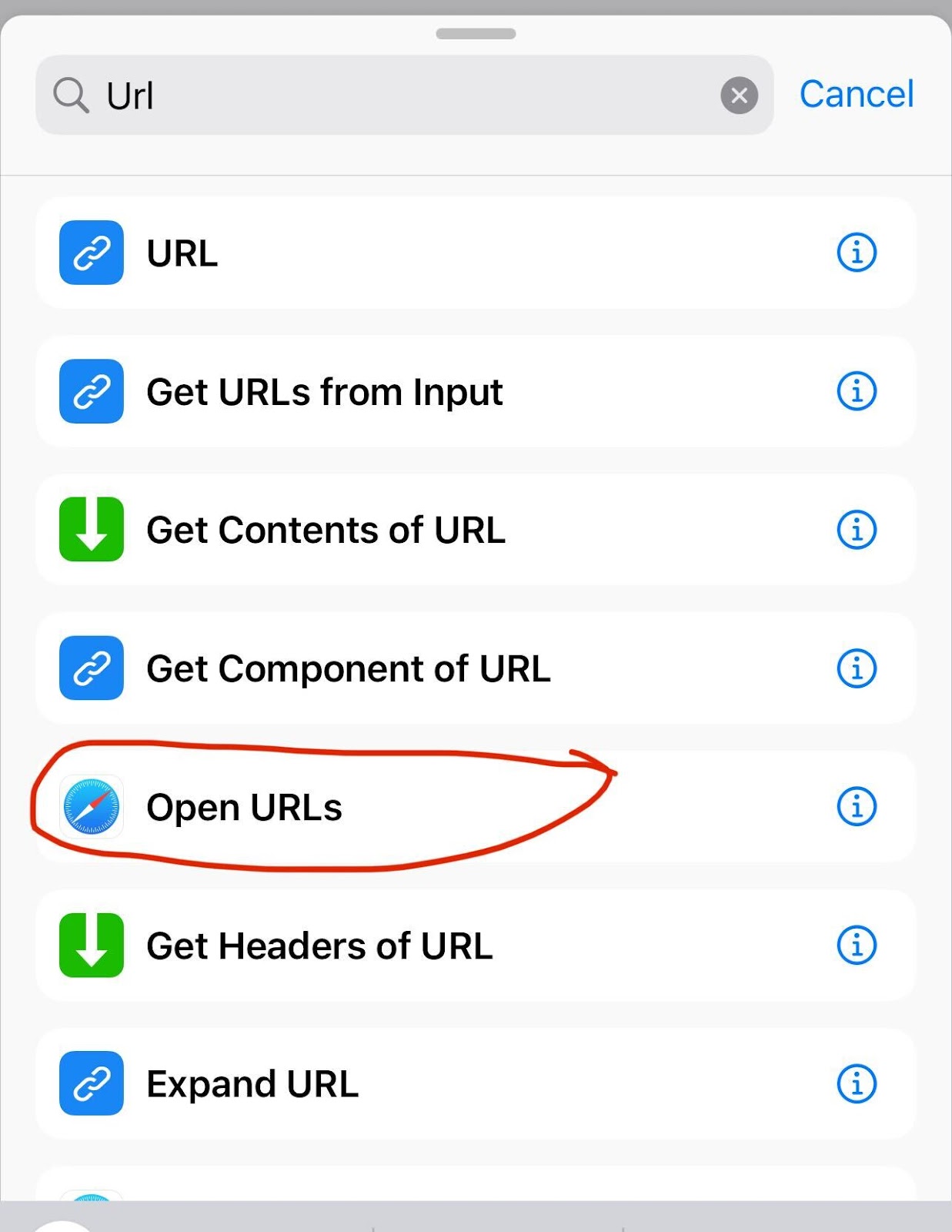 - Search for the the ‘Open URLs’ Action and click it