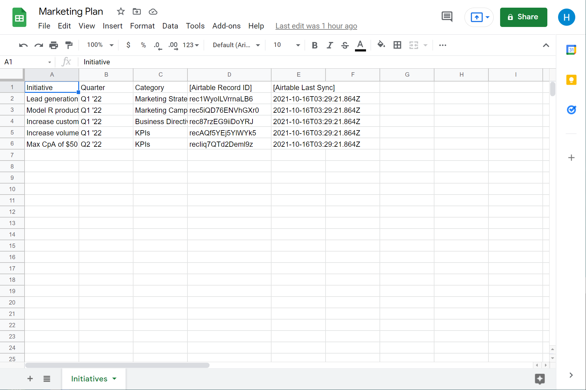 If everything is set up correctly and the test ran successfully, you should now see all the records from the Airtable Initiatives table synced to your Google Sheets file!
